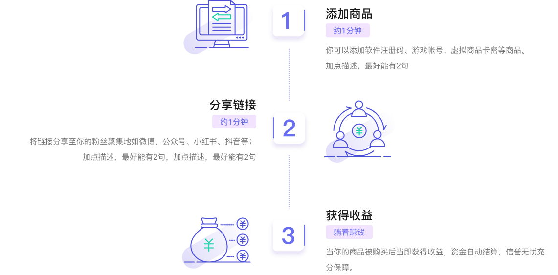 注册成为商家,将卡密托管在平台(软件注册码、游戏帐号、虚拟商品卡密等),为商家提供安全、便捷、绿色、稳定虚拟商品卡密自动交易服务。